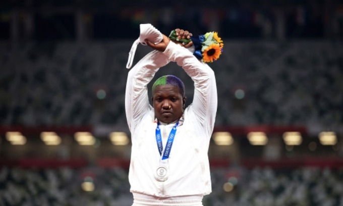 Vận động viên Mỹ Raven Saunders làm dấu chữ X trên đầu khi nhận huy chương bạc tại Olympic Tokyo hôm 1/8. Ảnh: Reuters.