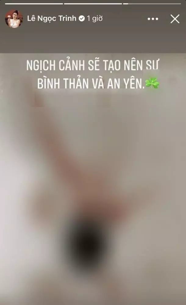 Không lâu sau khi tiết lộ bị phản bội, trên trang cá nhân, chân dài họ Lê cũng đăng tải hình ảnh chiếc bồn cầu dính đầy máu. Đính kèm là dòng trạng thái: "Nghịch cảnh sẽ tạo nên sự bình thản và an yên".