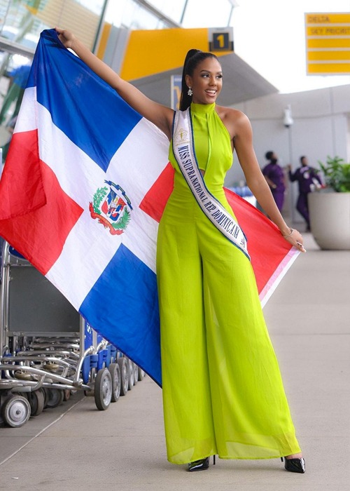 Eoanna Constanza - đại diện Cộng hòa Dominica - diện jumpsuit xanh tại sân bay. Người đẹp năm nay 25 tuổi, cao khoảng 1,78 m. Cô từng giành danh hiệu Á hậu 1 tại Miss Asia Pacific 2019.