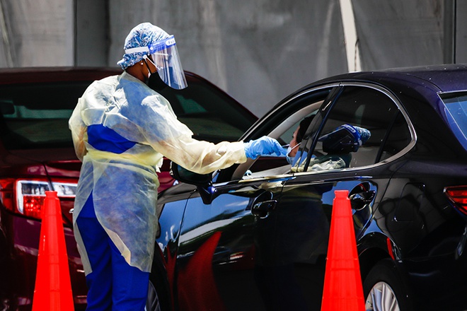 Nhân viên y tế lấy mẫu xét nghiệm Covid-19 tại Công viên Nhiệt đới ở Miami, Florida, ngày 6/8. Ảnh: Bloomberg.