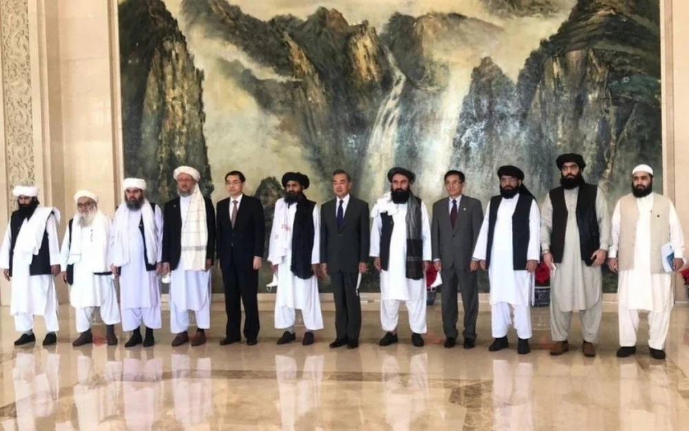 Các quan chức Trung Quốc chụp ảnh cùng với đoàn đại biểu Taliban đến thăm Trung Quốc vào cuối tháng 7 vừa qua. Ảnh: SCMP