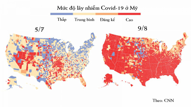 Những số liệu mới nhất từ CDC cho thấy tỷ lệ gia tăng đáng báo động số ca mắc tại những hạt được coi là có rủi ro lây nhiễm trong cộng đồng cao. Ngày 9/8, 2.361 hạt ở Mỹ được đưa vào danh sách có mức độ rủi ro cao, tăng đáng kể so với con số 457 hạt vào đầu tháng 7. So với 5 tuần trước, có thể thấy mức độ lây nhiễm nhanh chóng trong cộng đồng của dịch bệnh Covid-19 đã tăng trên khắp nước Mỹ.