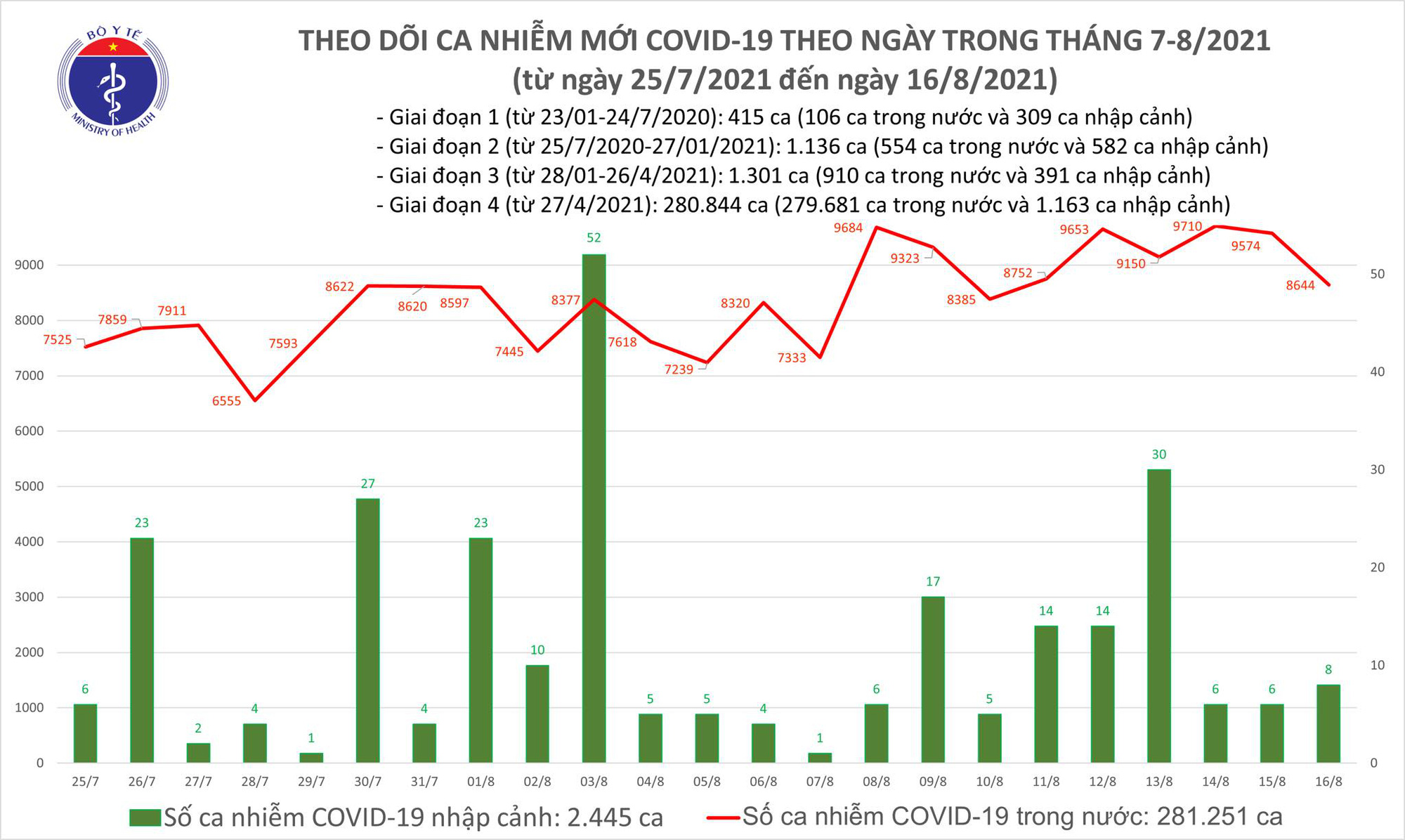 Tính từ 18h ngày 15/8 đến 18h ngày 16/8, trên Hệ thống Quốc gia quản lý ca bệnh COVID-19 ghi nhận 8.652 ca nhiễm mới, trong đó 08 ca nhập cảnh và 8.644 ca ghi nhận trong nước tại TP. Hồ Chí Minh (3.341), Bình Dương (2.522), Long An (599), Đồng Nai (588), Khánh Hòa (262), Đồng Tháp (158), Tiền Giang (152), Vĩnh Long (131), Đà Nẵng (96), An Giang (87), Cần Thơ (86), Sóc Trăng (75), Trà Vinh (71), Phú Yên (62), Thừa Thiên Huế (60), Tây Ninh (52), Hà Nội (50), Bình Thuận (33), Kiên Giang (32), Ninh Thuận (27), Gia Lai (25), Nghệ An (24), Hà Tĩnh (17), Đắk Lắk (11), Quảng Nam (11), Bắc Ninh (11), Lâm Đồng (8 ), Thanh Hóa (6), Nam Định (6), Hậu Giang (6), Bình Phước (6), Lạng Sơn (4), Cà Mau (4), Quảng Ngãi (4), Ninh Bình (3), Bình Định (3), Lào Cai (2), Quảng Bình (2), Sơn La (2), Bạc Liêu (2), Hà Nam (1), Hải Dương (1), Thái Nguyên (1) trong đó có 2.422 ca trong cộng đồng.