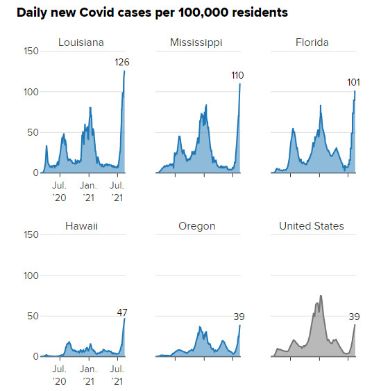 Theo thống kê mới nhất, Florida, Louisiana, Hawaii, Oregon và Mississippi đều đã phá kỷ lục về số ca mắc Covid-19 trong trung bình 7 ngày tính tới 15/8. Tính theo bình quân đầu người, Louisiana, Mississippi và Florida đang phải hứng chịu những đợt bùng phát dịch tồi tệ nhất cả nước.