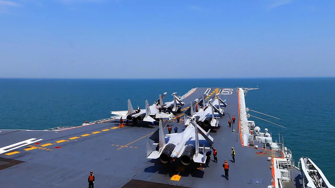 (Ảnh minh họa) - Các chiến đấu cơ J15 trên hàng không mẫu hạm Liêu Ninh của Trung Quốc trong một cuộc tập trận ngày 24/04/2018. AFP