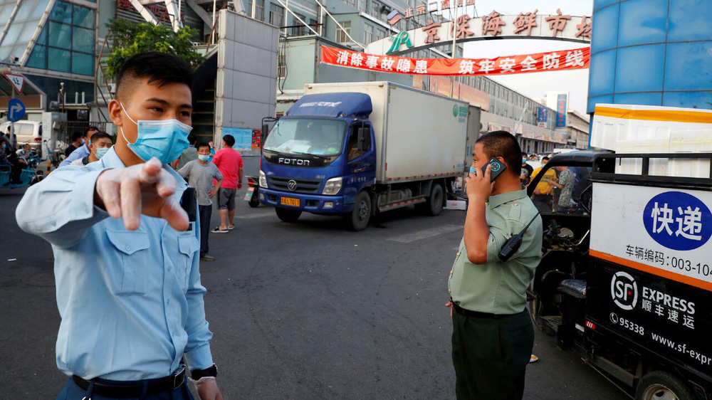 Nhân viên an ninh đeo khẩu trang bên ngoài chợ hải sản Jingshen ở thủ đô Bắc Kinh, Trung Quốc, ngày 12/6/2020 (Ảnh: Reuters)