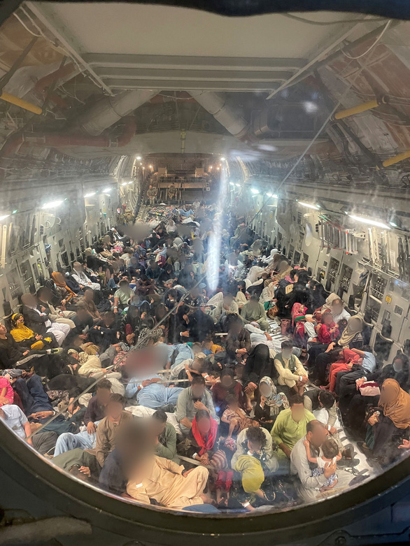 Một chuyến bay sơ tán người khỏi Afghanistan ngày 22-8 trên máy bay C-17 của không quân Anh - Ảnh: Quân đội Anh cung cấp cho REUTERS