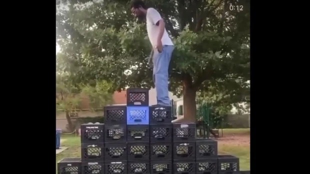 Đoạn phim được đăng tải bởi công ty sản xuất đa phương tiện Sir Veillance Studios, cho thấy một người đàn ông cố gắng leo lên một chiếc cầu thang được dựng từ những thùng sữa nhựa.