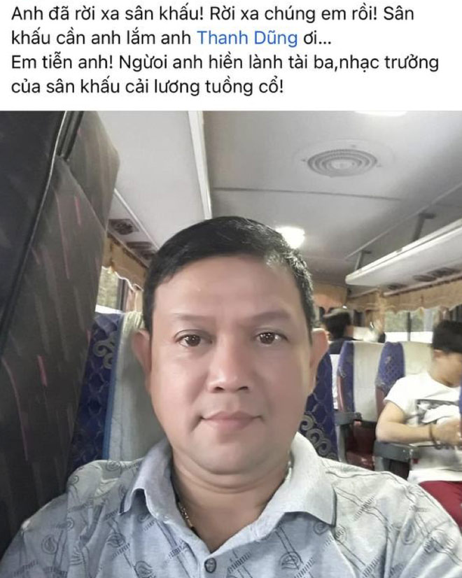 Trên trang cá nhân, Gia Bảo báo tin buồn về sự ra đi của nghệ sĩ Thanh Dũng: “Anh đã rời xa sân khấu, rời xa chúng em rồi. Sân khấu cần anh lắm anh Thanh Dũng ơi. Em tiễn anh! Người anh hiền lành tài ba, nhạc trưởng của sân khấu cải lương tuồng cổ!”.