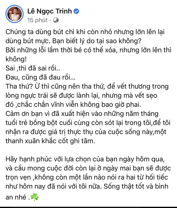 Không trực tiếp nhắc tên Liễu Quang Vinh nhưng Ngọc Trinh đã nghẹn ngào xúc động nhắn nhủ: "Cảm ơn bạn vì đã xuất hiện vào những năm tháng tuổi trẻ bồng bột cuối cùng còn sót lại trong tôi, để tôi nhận ra được giá trị thực thụ của cuộc sống này, một thanh xuân khắc cốt ghi tâm.