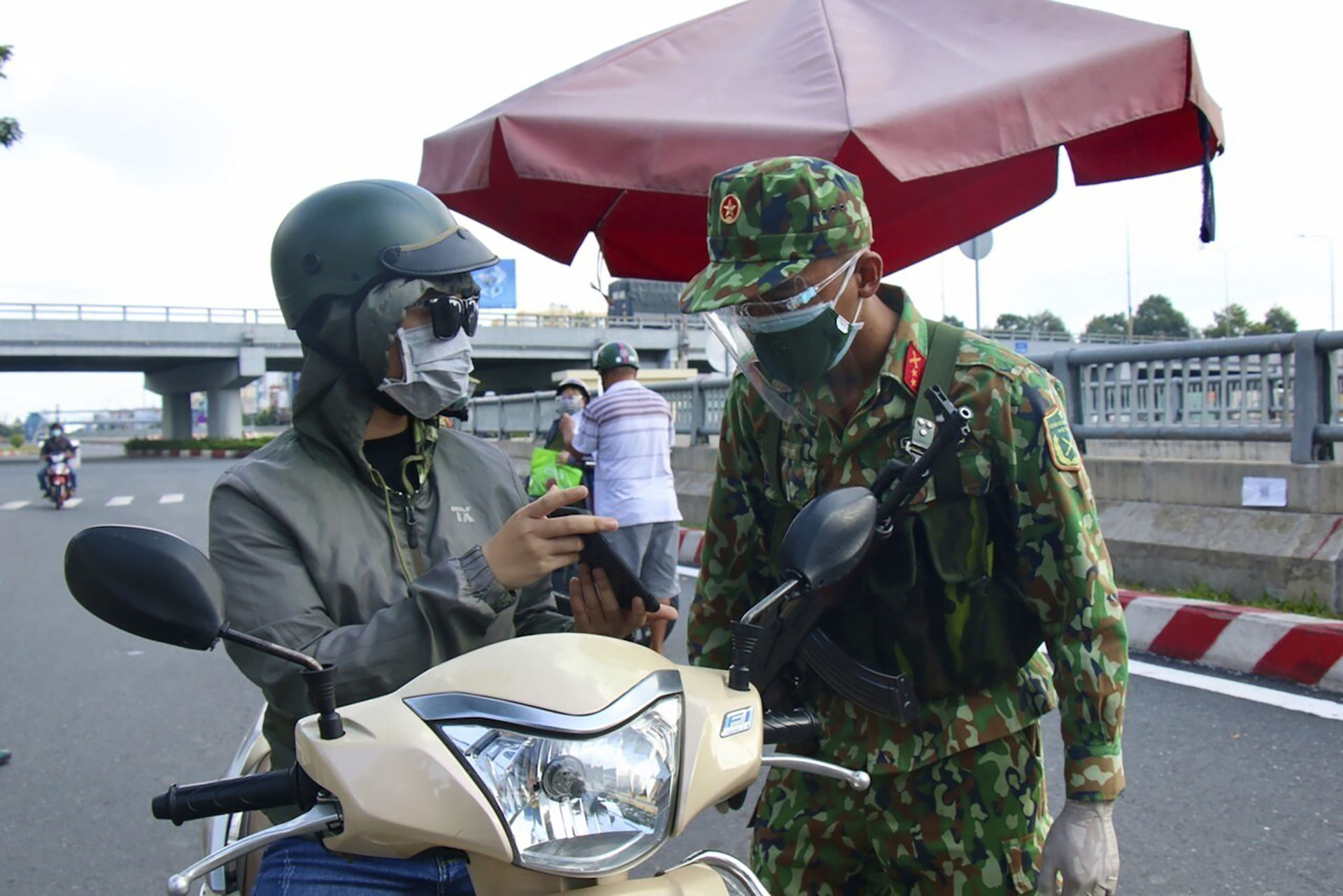 Một binh sĩ kiểm tra giấy phép đi đường của một người dân trong những ngày Sài Gòn “ai ở đâu yên đó.” (Hình: Vu Tien Luc/VNA via AP)