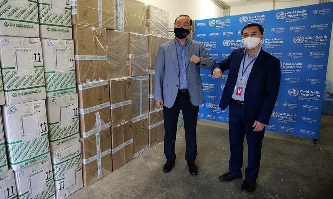"Chúng tôi hy vọng số vật tư y tế này sẽ giúp bảo vệ nhân viên y tế và cứu tính mạng của các bệnh nhân", Tiến sĩ Kidong Park, Trưởng đại diện WHO tại Việt Nam nói khi bàn giao lô hàng cho Bộ Y tế, ngày 27/8. Dự kiến thêm nhiều trang thiết bị y tế đến trong những ngày tới.