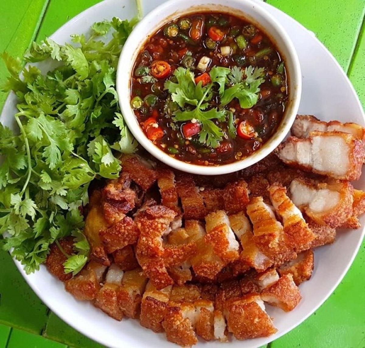 -Thịt chín thì gắp ra, thấm cho ráo dầu rồi thái miếng vừa ăn. Thịt rán có phần vỏ ngoài giòn tan nhưng ở trong vẫn mềm mọng, ăn kèm với nước chấm chua ngọt đảm bảo ai cũng thích.