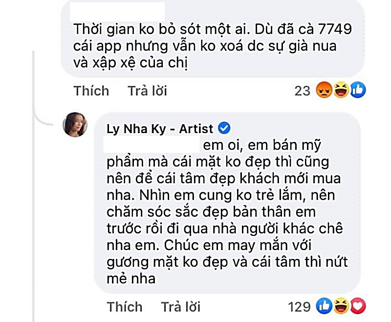 Bên cạnh lời khen, cũng có bình luận nói rằng: "Thời gian không bỏ sót một ai. Dù đã cà 7749 cái app nhưng vẫn không xóa được sự già nua và xập xệ của chị". Sau đó, Lý Nhã Kỳ đã có động thái đáp lại ý kiến trên.