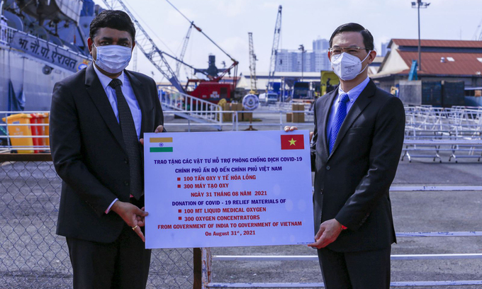 Việt Nam cảm ơn sự hỗ trợ của Ấn Độ trong buổi lễ tiếp nhận trang thiết bị y tế, bao gồm 100 tấn oxy, tại TP HCM hôm nay.