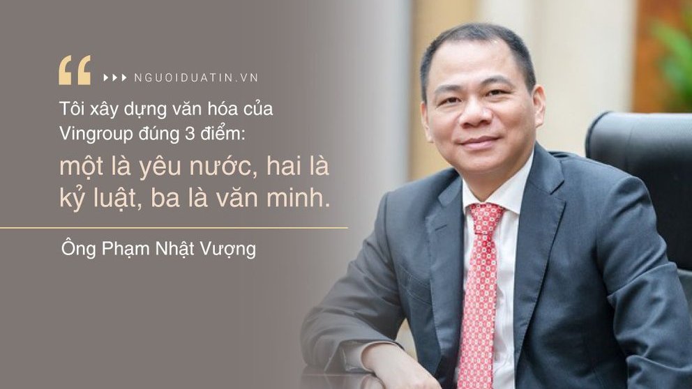 Trong một lần chia sẻ với báo chí, Chủ tịch Vingroup Phạm Nhật Vượng từng nói: "Tôi xây dựng văn hóa của Vingroup đúng 3 điểm: Một là yêu nước, hai là kỷ luật, ba là văn minh. Chốt lại có đúng 3 từ đấy thôi".