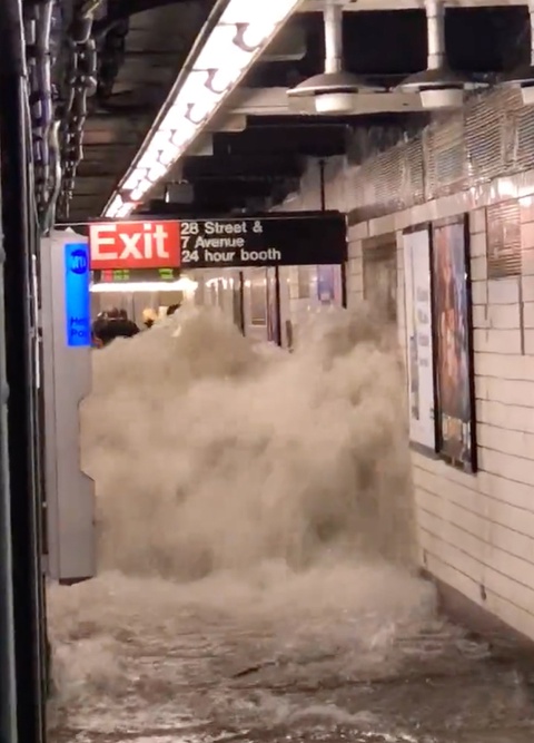 Ảnh chụp màn hình từ video trên mạng xã hội cho tháy nước tràn xối xả vào một ga tàu điện ở thành phố New York. Ảnh: Twitter/SubwayCreatures.