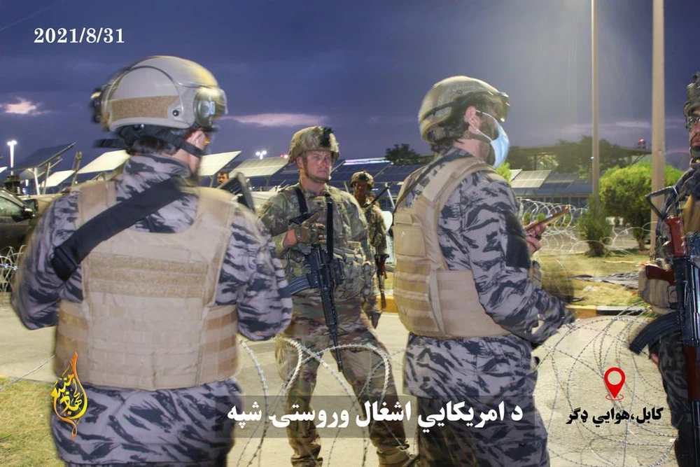 LÍnh Mỹ và "Đặc nhiệm Badri 313" của Taliban nói chuyện bên ngoài Sân bay Quốc tế Kabul rạng sáng 31/8 trước khi Quân đội Mỹ rút hoàn toàn khỏi Afghanistan (Nguồn: Kênh truyền thông Al-Hijra của Taliban).