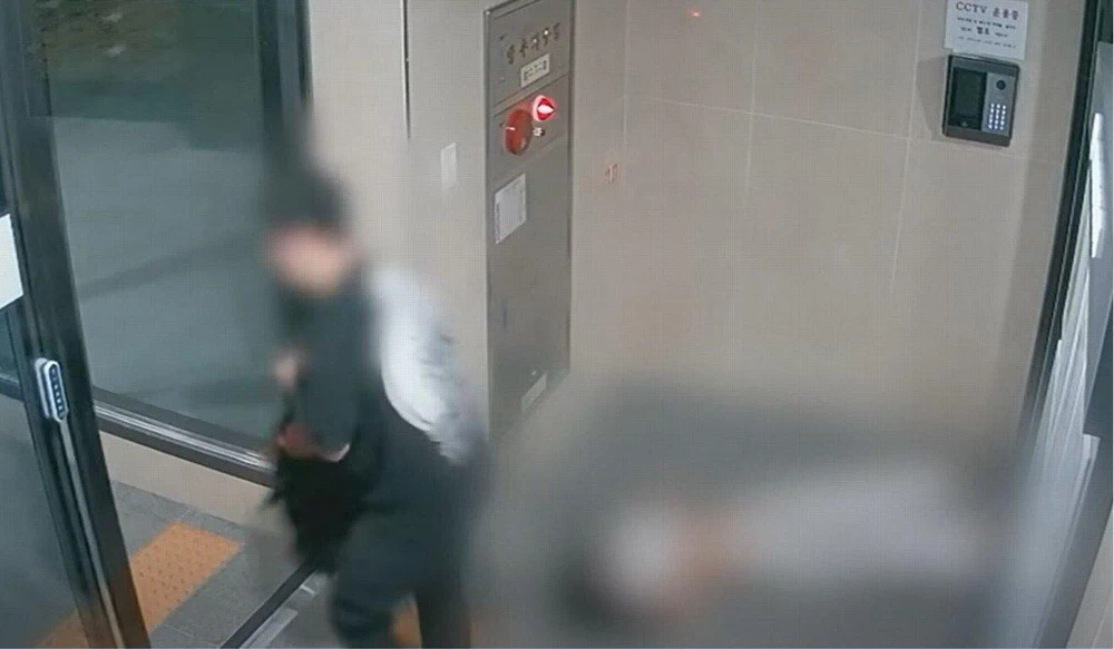 Một cảnh quay từ camera giám sát được công bố cho các phương tiện truyền thông cho thấy cô Hwang Ye-jin (phải) nằm bất tỉnh trên sàn khi bị người bạn trai lôi ra khỏi thang máy. Ảnh: YouTube