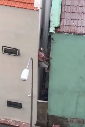 Theo dõi đoạn clip có thể thấy, nam thanh niên này đã chui lên mái nhà, rồi lợi dụng khoảng cách hẹp giữa 2 dãy nhà rồi men theo tường, từ từ xuống đất. Đáng nói, toàn bộ hành động nguy hiểm này chỉ diễn ra khoảng chừng 1 phút ngắn ngủi.