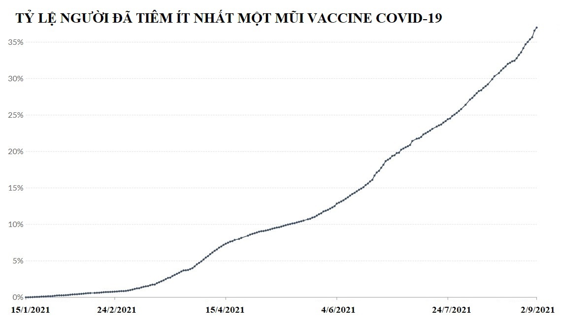 Khoảng 37% người dân Ấn Độ đã được tiêm ít nhất 1 mũi vaccine Covid-19. Nguồn: Our World in Data.