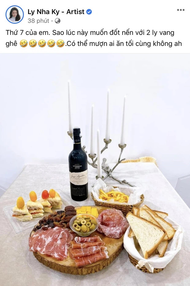 Mới đây, Lý Nhã Kỳ vừa đăng tải bức ảnh ăn tối trên trang Facebook cá nhân, đính kèm là dòng trạng thái: "Thứ 7 của em. Sao lúc này muốn đốt nến với 2 ly vang ghê. Có thể mượn ai ăn tối cùng không ạ".