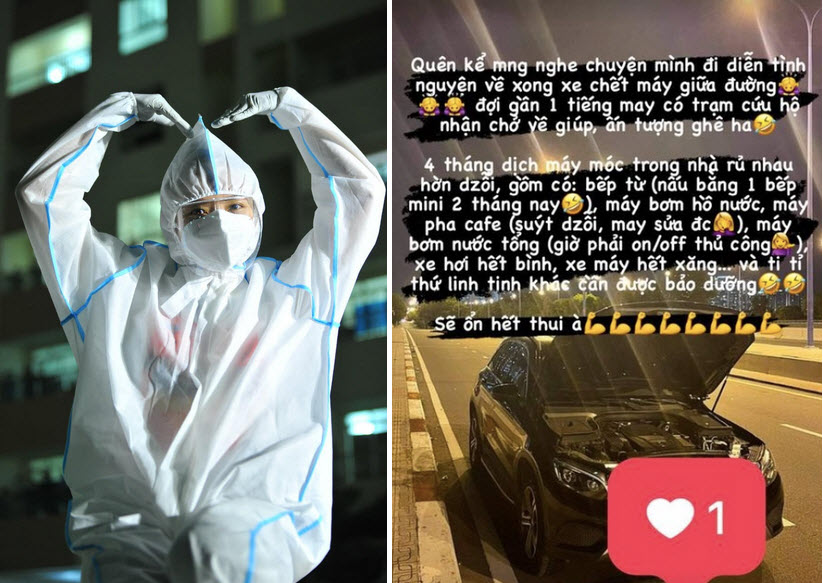 Ngày 7/9, quản lý của Tóc Tiên chia sẻ với PV việc nữ ca sĩ gặp sự cố khi đi diễn ở bệnh viện dã chiến. "Sau khi Tóc Tiên hoàn thành đêm diễn và được Touliver đưa về nhà, chiếc xe của vợ chồng cô ấy bị hỏng ngang đường. Họ phải chờ đội cứu hộ trong hơn một tiếng vào lúc đêm muộn mới có thể đưa được xe về nhà", người đại diện nói.