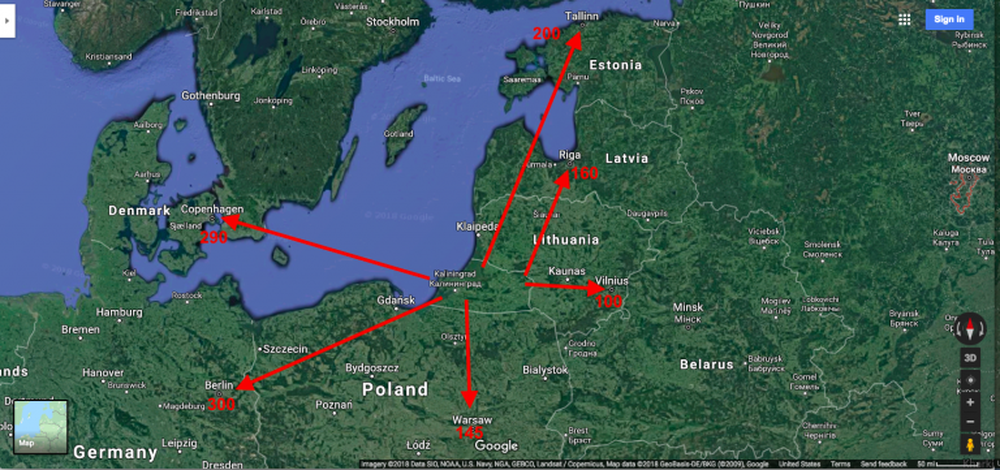Khoảng cách từ Kaliningrad tới một số thủ đô của NATO trên bản đồ. Ảnh: Google Maps