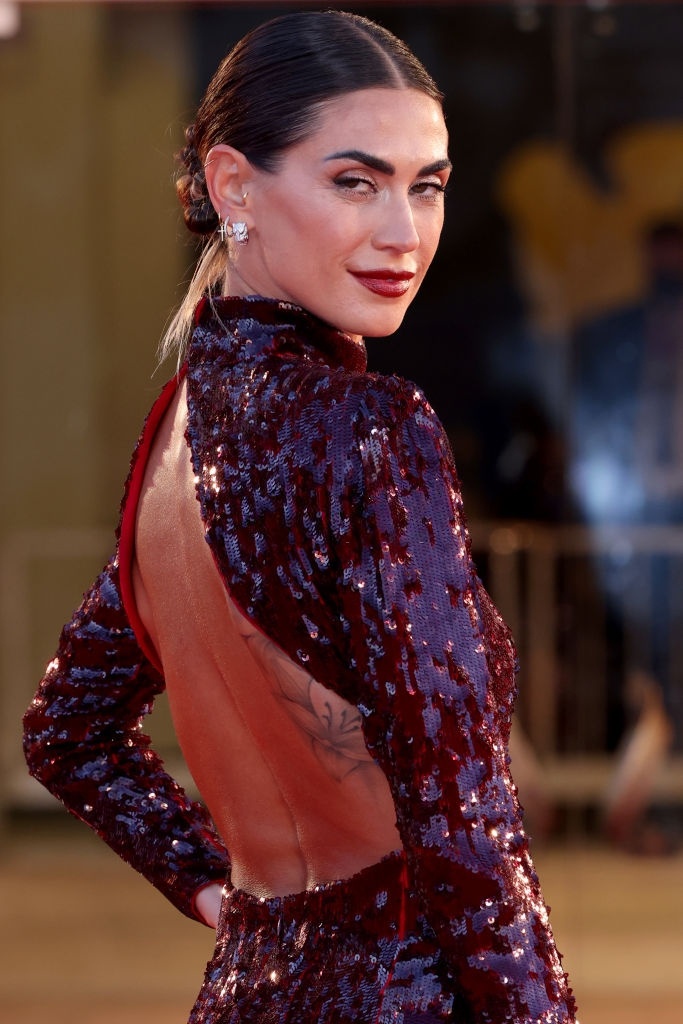 Melissa Satta mặc đầm đính sequin có phần cầu vai vuông toát ra vẻ quyền lực và mạnh mẽ. Thiết kế hở lưng giúp cô khoe hình xăm. Satta là người mẫu và MC người Italy. Ngôi sao 35 tuổi từng kết hôn với Christian Vieri nhưng đổ vỡ năm 2011. Sau đó, cô bắt đầu mối tình lãng mạn với tiền vệ Kevin-Prince Boateng.