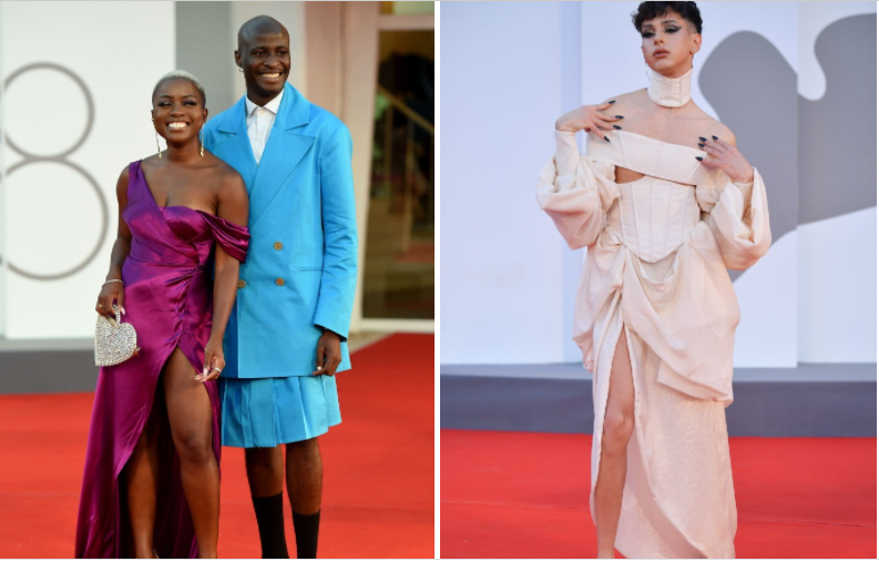 Người mẫu nam Demi Oyenekan (trái) phối chân váy với blazer theo xu hướng unisex - phong cách thời trang thịnh hành ở châu Âu. Trong khi đó, ngôi sao mạng xã hội Gabriele Garancini xuất hiện với vẻ ngoài nữ tính, từ váy áo đến make-up.