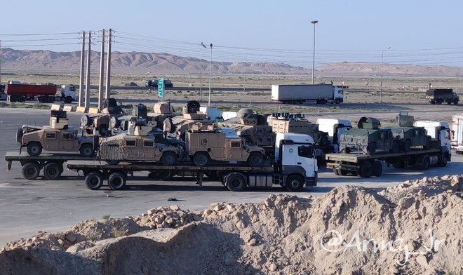 Xe thiết giáp Humvee cùng một số phương tiện quân sự khác trên xe tải chuyên dụng được nhìn thấy ở cao tốc nối thành phố Semnan với thành phố Garmsar, phía đông nam thủ đô Tehran, Iran.
