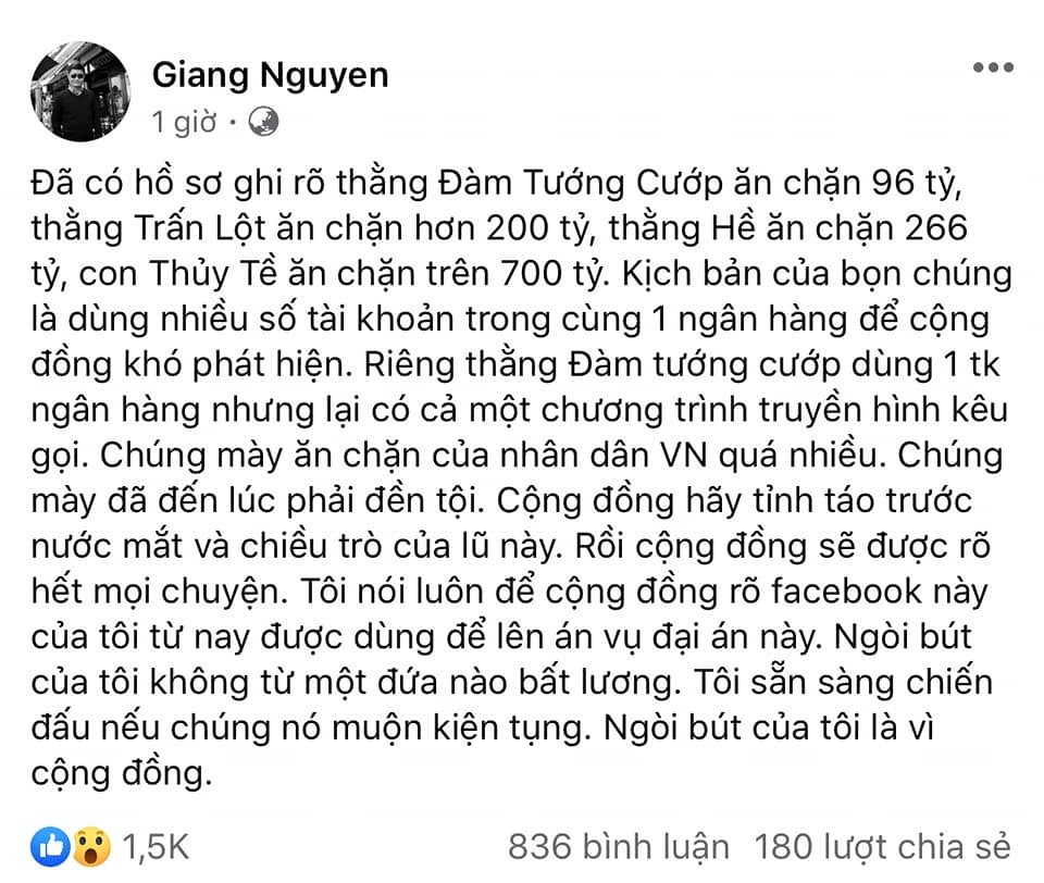 Chúng mày ăn chặn của nhân dân Việt Nam quá nhiều. Chúng mày đã đến lúc phải đền tội. Cộng đồng hãy tỉnh táo trước nước mắt và chiều trò của lũ này. Rồi cộng đồng sẽ được rõ hết mọi chuyện. Tôi nói luôn để cộng đồng rõ, Facebook này của tôi từ nay được dùng để lên án vụ đại án này. Ngòi bút của tôi không từ một đứa nào bất lương. Tôi sẵn sàng chiến đấu nếu chúng nó muộn kiện tụng. Ngòi bút của tôi là vì cộng đồng”.