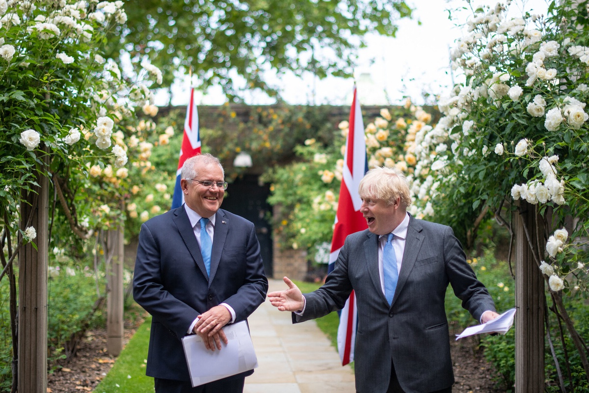 Thủ tướng Australia Scott Morrison (trái) và Thủ tướng Anh Boris Johnson tại London, Anh vào tháng 6. Ảnh: New York Times.