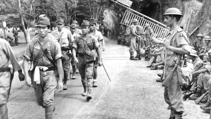 Vào ngày 15/2/1942, Trung tướng Arthur Percival, chỉ huy quân đội Anh tại Singapore, đã gặp Tướng Yamashita để ký một bản đầu hàng vô điều kiện. Hơn tám vạn quân Anh đã bị bắt làm tù binh, trong đó nhiều người đã chết trong các trại tù binh Nhật Bản, hoặc chết khi làm việc cưỡng bức, trên tuyến đường sắt khét tiếng Miến Điện - Thái Lan. Ảnh: Warhistory.