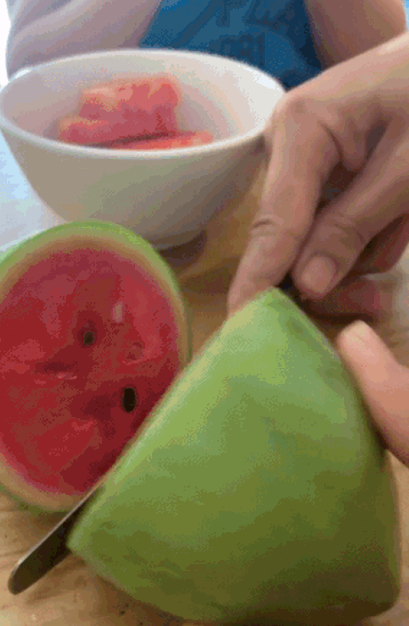 Người mẹ tiếc hùi hụi vì quả còn non nhưng vẫn bổ ra ăn thử. Kết quả ngoài sức tưởng tượng. Bên trong vỏ dưa rất mỏng, ruột dưa chín đỏ khiến ai cũng muốn ăn liền.