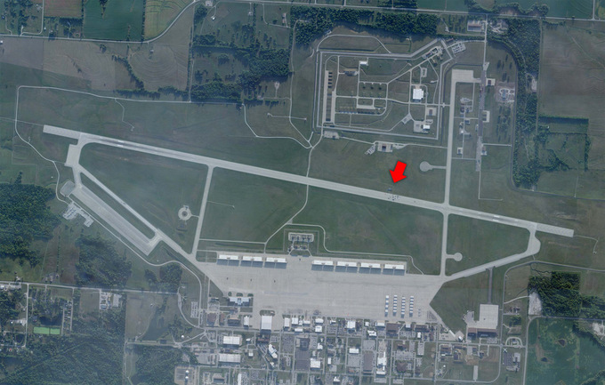 Ảnh vệ tinh cho thấy oanh tạc cơ B-2 sập càng trái, quệt cánh xuống bãi cỏ cạnh đường băng căn cứ Whiteman sau khi hạ cánh khẩn.