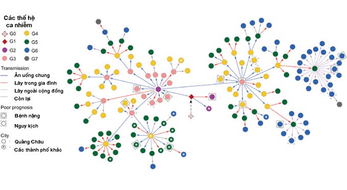 Bản đồ của nhóm nghiên cứu hiển thị đường lây 157 ca nhiễm đại diện. Mỗi thế hệ bệnh nhân gọi là G0, G1, G2,... (tương ứng với F0, F1, F2,...). Các mũi tên màu biểu thị các đường lây truyền khác nhau, bao gồm ăn uống, lây trong gia đình, cộng đồng và nguồn lây khác.