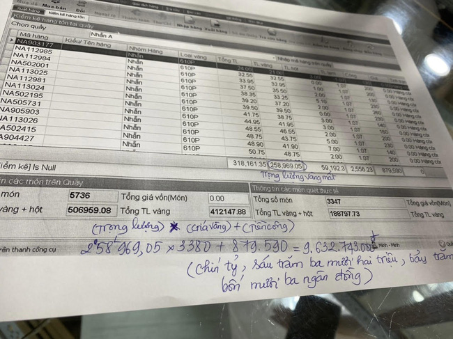 Tài liệu mà chủ Tiệm vàng Kim Hương thống kê ban đầu số lượng vàng bị lấy trộm. (Ảnh: K.H)