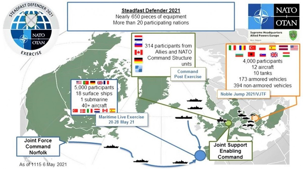 Mỹ-NATO: Từ tháng 3-6/2021 đã tổ chức cuộc tập trận lớn mang tên Defender Europe 2021 (Bảo vệ châu Âu). NATO triển khai lực lượng gần như lớn nhất của mình với đầy đủ quân binh chủng, để tiến hành các hoạt động phòng thủ và tấn công trên toàn bộ không gian từ Biển Đen đến Biển Baltic.