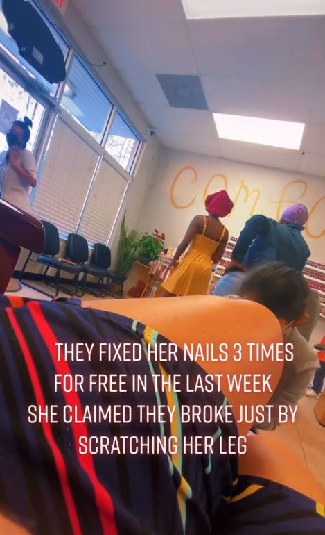 Người khách này ngày càng khó chịu khi nhân viên tiệm cố gắng giải thích tình hình. Một đoạn text cho người xem biết rằng “họ đã sửa móng tay của cô ta 3 lần miễn phí trong tuần trước. Cô ta khẳng định móng tay gãy khi cô ta chỉ ‘gãi chân’ ”.