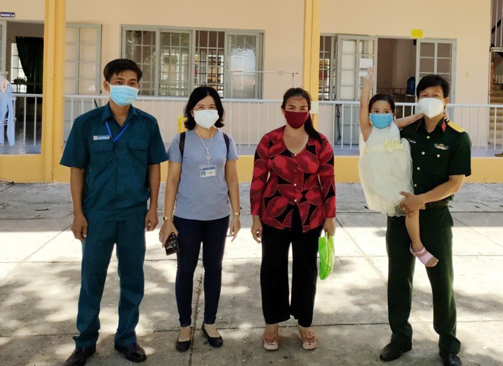Thiếu tá Nguyễn Trung Kiên (bìa phải), Trợ lý Quân khí, Bí thư Đoàn thanh niên Ban chỉ huy Quân sự TP. Thủ Đức bàn giao cháu Phạm Thị Bảo Châu tại khu cách ly tập trung Trường TH Thắng Tam (Ảnh: Báo Bà Rịa - Vũng Tàu)