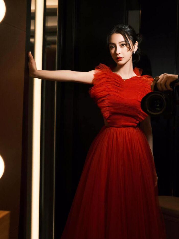 "Đại sứ thương hiệu Angelababy mặc thiết kế Dior Thu/Đông 2021 Ready-to-wear xuất hiện tại LHP Quốc tế Bắc Kinh. Chiếc váy đỏ nhẹ nhàng duyên dáng kết hợp với hoa tai kim cương SATINE và nhẫn DIOR À VERSAILLES, mang đến cảm giác lãng mạn phong tình".