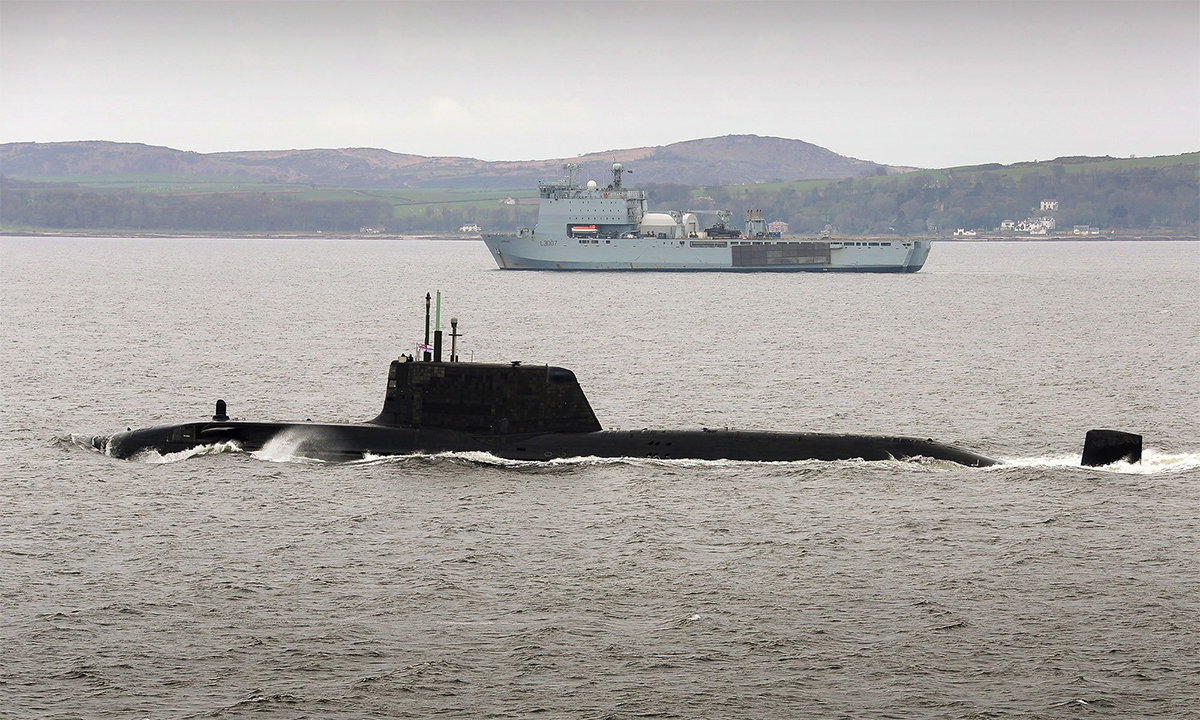 Tàu ngầm HMS Ambush (trước) và tàu hậu cần RFA Lyme Bay (sau) tham gia diễn tập Joint Warrior ở vịnh Faslane, Anh tháng 4/2019. Ảnh: Twitter/NavyLookout.