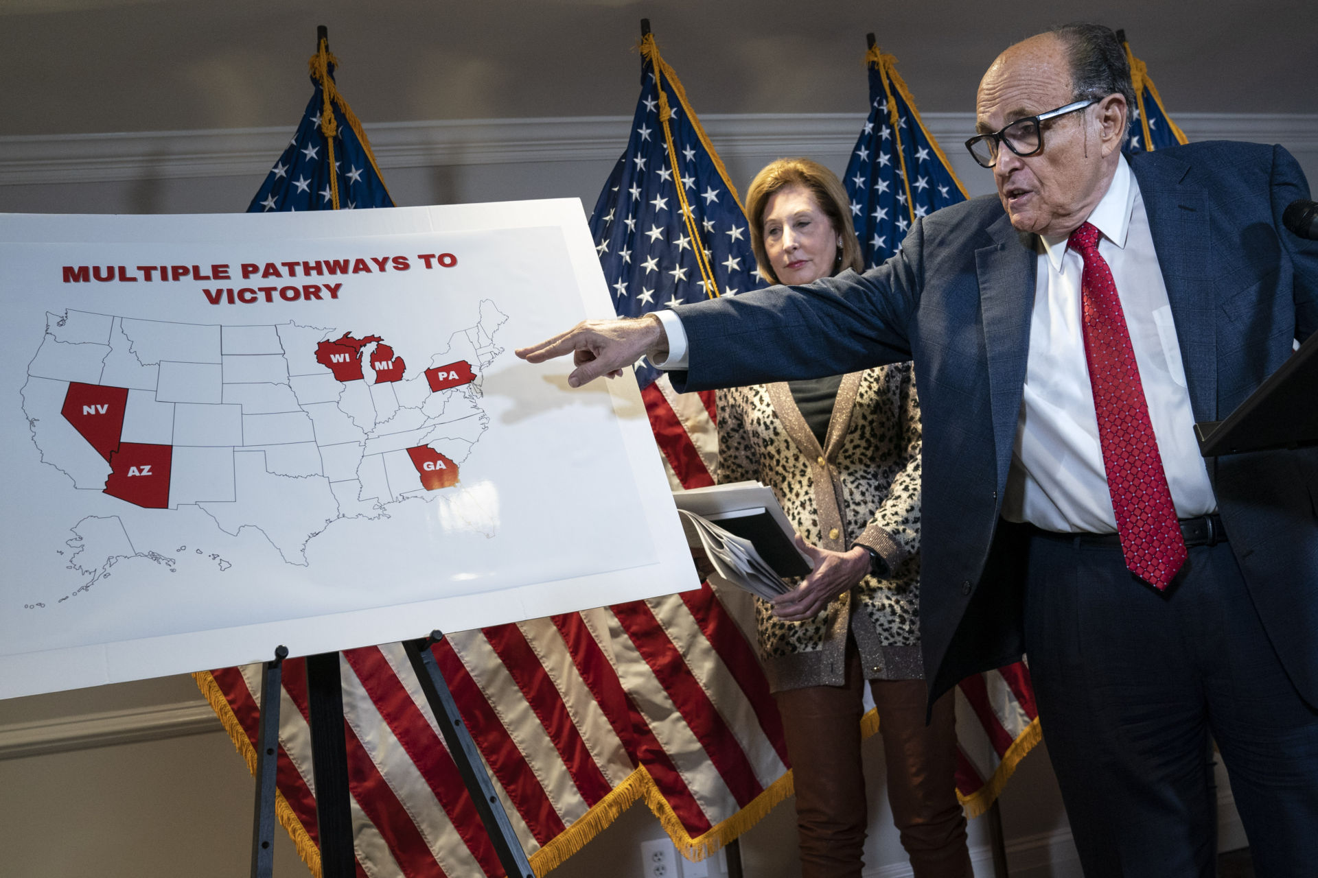 Trong cuộc họp báo ngày 19 Tháng Mười Một, 2020, đội ngũ pháp lý của cựu tổng thống, đứng đầu là ông Rudy Giuliani, tố cáo vô căn cứ rằng công ty Dominion, sản xuất máy đếm phiếu, toa rập với tỷ phú George Soros và chính quyền Venezuela đã âm mưu “gian lận” bầu cử đánh cướp chiến thắng của ông Trump.