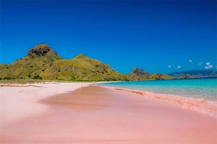 Bãi biển Pink là một phần của Vườn Quốc gia Komodo với nước biển màu xanh ngọc tương phản với màu hồng của cát biển và bầu trời xanh tạo nên khung cảnh đẹp như tranh vẽ và thậm chí khi hoàng hôn xuống thì còn đẹp hơn. Bên dưới mặt nước là những rạn san hô và hàng nghìn loài cá.