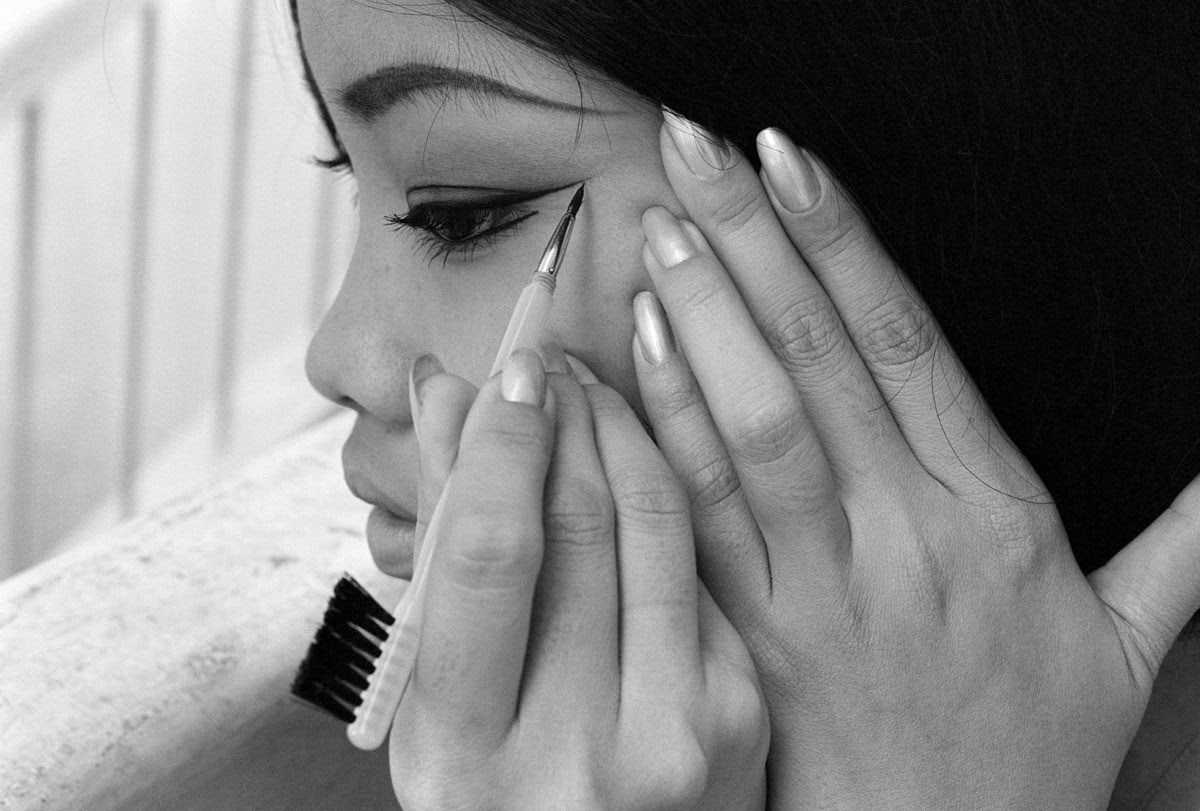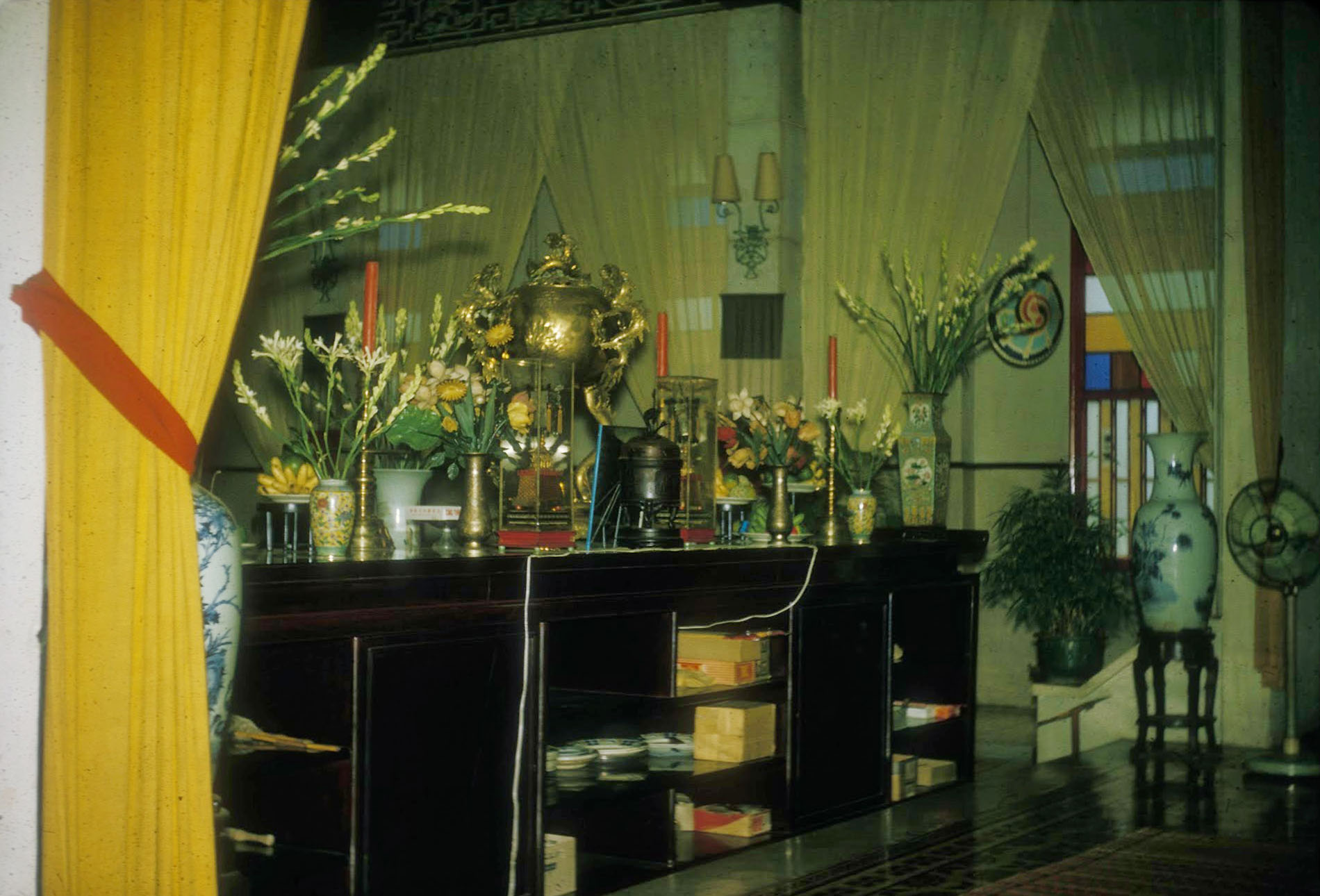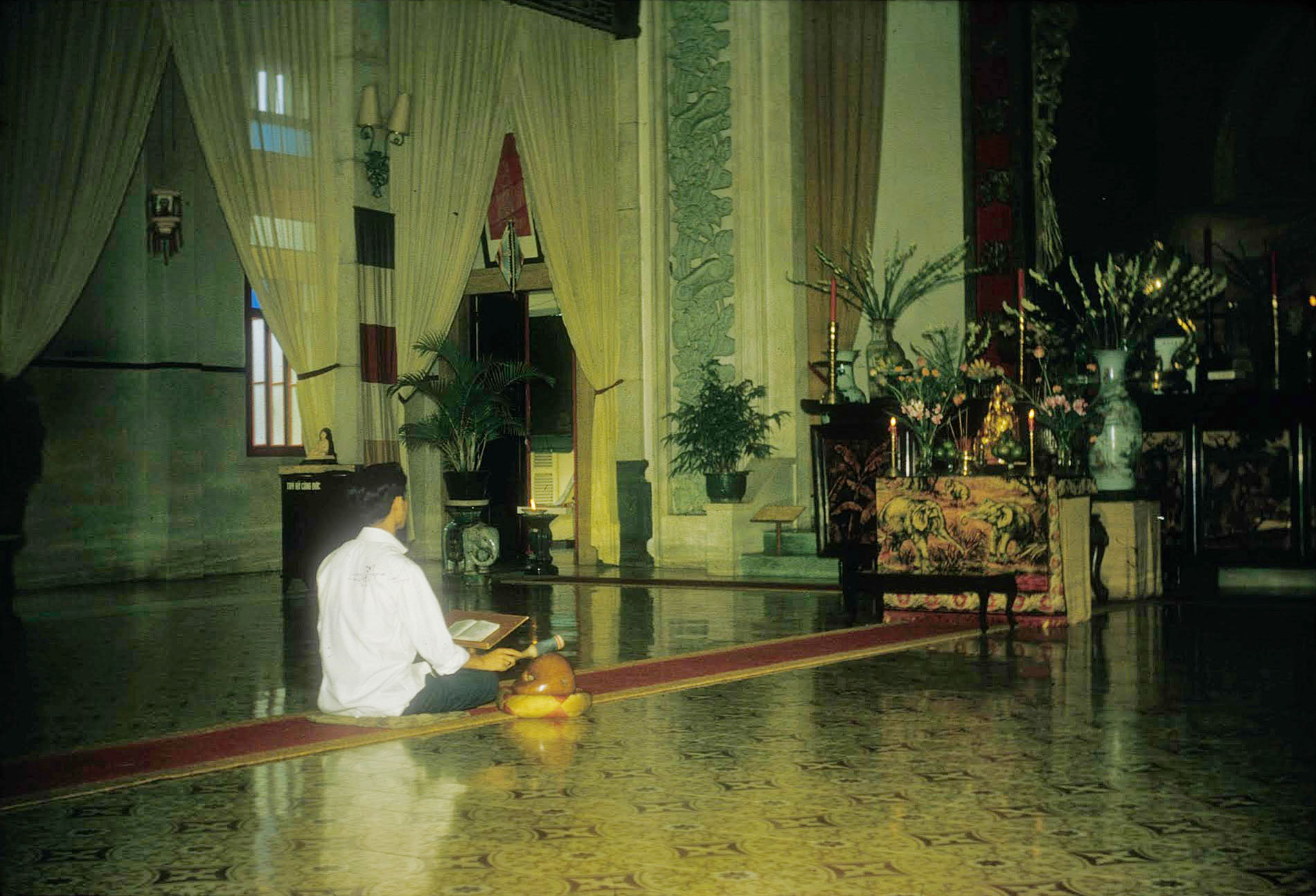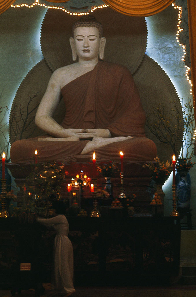 Một người phụ nữ đi chân trần đến bàn thờ đây là theo yêu cầu của phong tục. Ảnh chụp chánh điện chùa năm 1965.