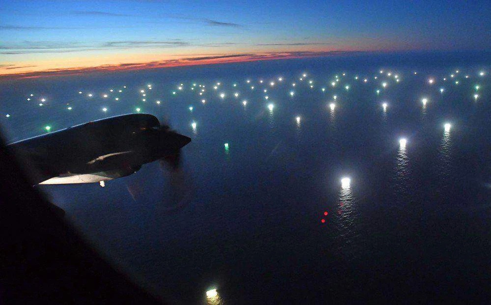 Hoạt động đánh bắt tiến hành vào buổi đêm khi các tàu bật hàng trăm ngọn đèn sáng như sân vận động để dụ mực. Mức độ ánh sáng tập trung cao tới mức có thể quan sát được từ không gian. Những bức ảnh vệ tinh cho thấy đội tàu cá khổng lồ phát ra mức ánh sáng tương tự như những thành phố lớn cách đó hàng trăm dặm.