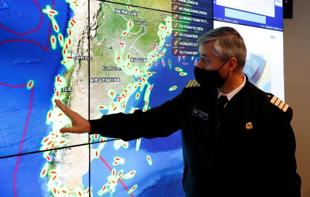 Tư lệnh Peru chỉ ra những vị trí mà nước này theo dõi số lượng lớn tàu cá của Trung Quốc. Ảnh: Reuters