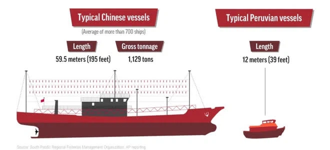 Quy mô tàu cá Trung Quốc (trái) so với tàu cá của Peru (phải). Minh họa: AP