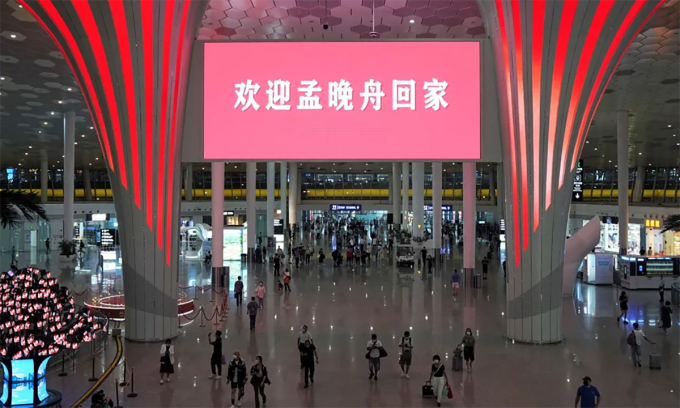 Bảng điện tử hiện dòng chữ “chào mừng Mạnh Vãn Chu về nhà” tại sân bay Bảo An Thâm Quyến, Trung Quốc ngày 25/9. Ảnh: Reuters .